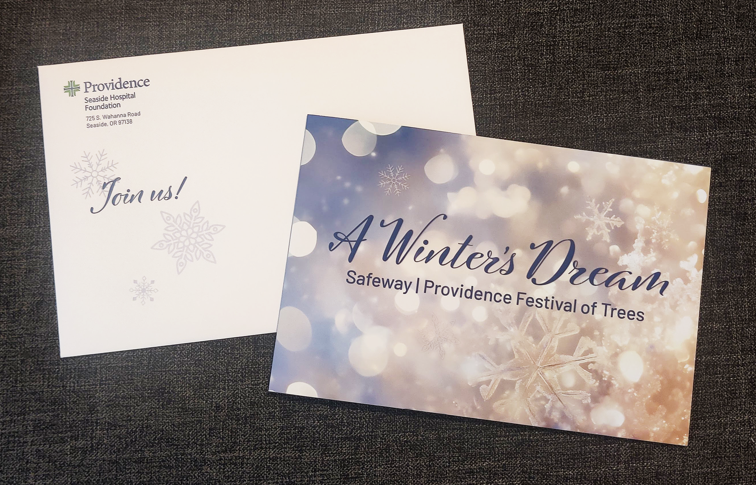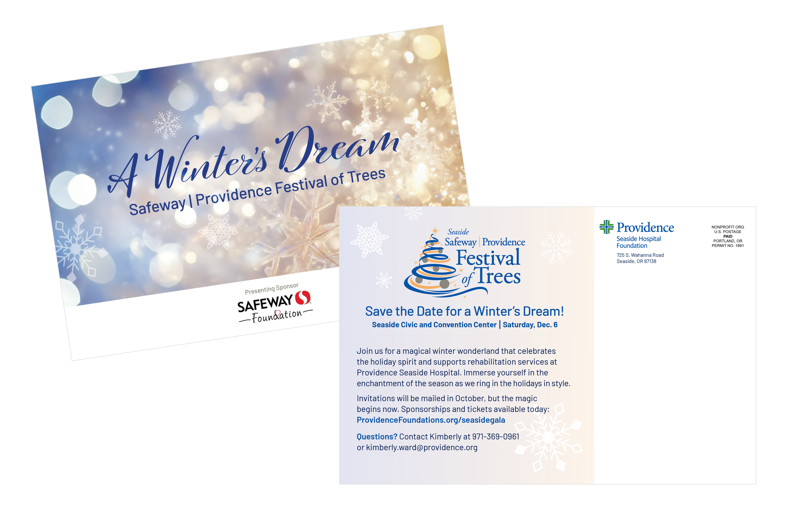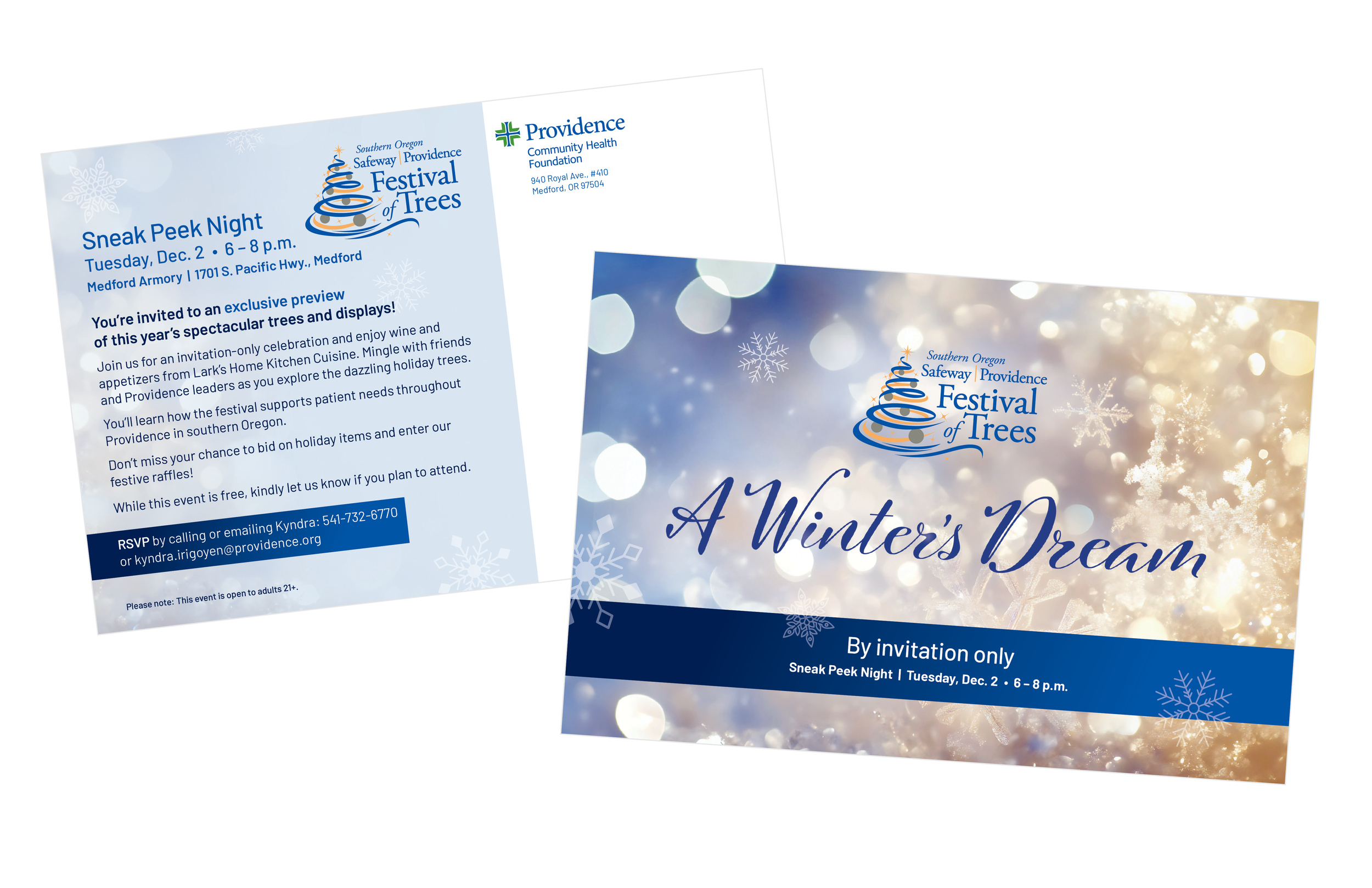 Description: For this multiple location fund-raising event, I established the look and feel, then applied it across multiple touch points, both print and digital. For the main invitations, in addition to it being printed in four color process, it also used a spot varnish technique for the snowflakes, up-leveling the quality.